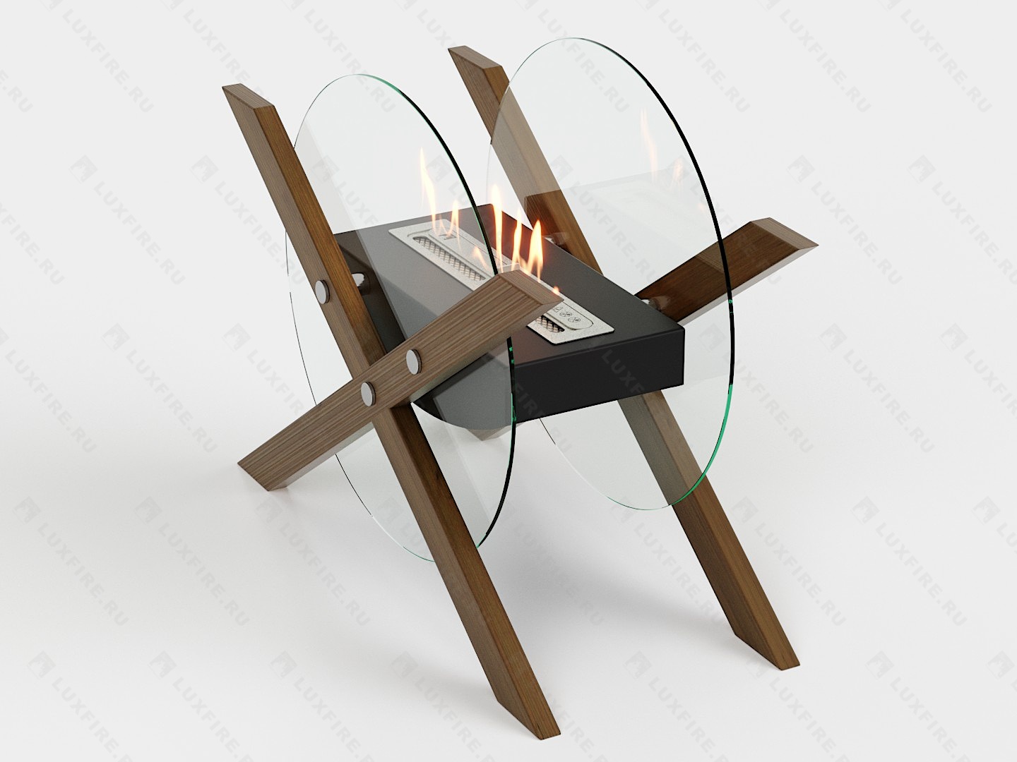 Представляет собой сборную модель оригинального авторского дизайна студии "Vontaren&Grinero" из закаленного стекла и топливного блока Luxfire 350 XS на подиуме, закрепленного на 4 дистанционных держателях. С деревянными натуральными накладками и обработанных огнебиозащитным средством.