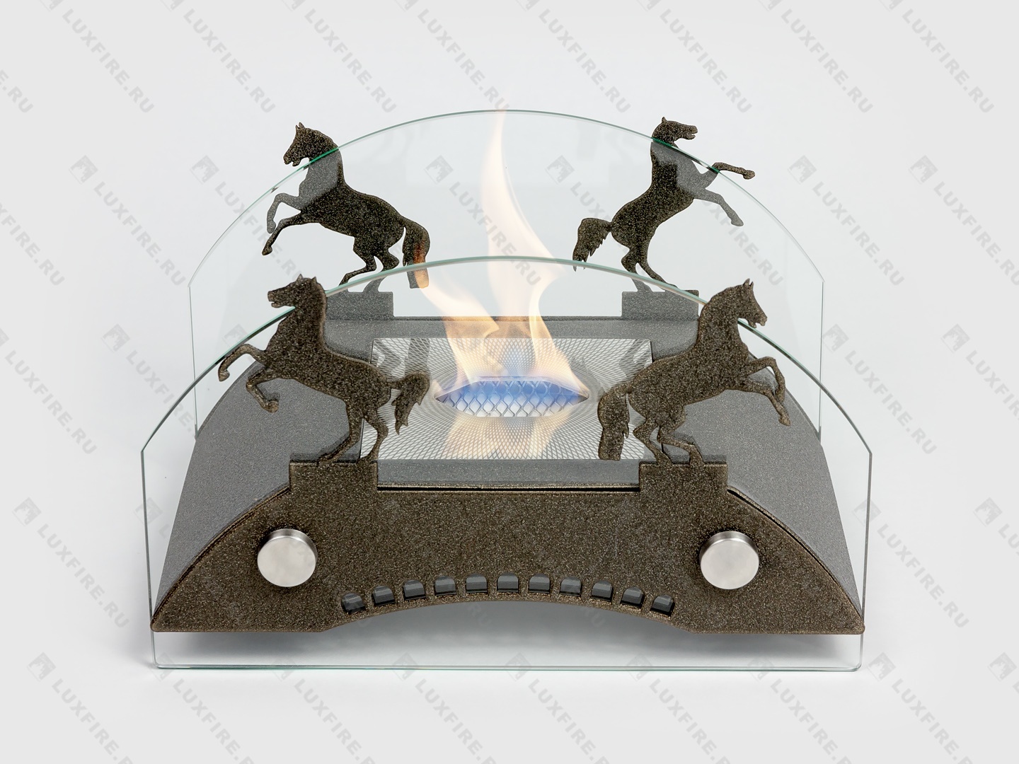 Представляет собой биокамин, который создан по мотивам мостов дореволюционной России середины ХIX-начала XX века и состоит из металлического корпуса с топливным блоком Lux Fire 100-1 огражденным с двух сторон скругленными защитными стеклами на дистанционных держателях и декоративными металлическими накладками в виде «Коней»